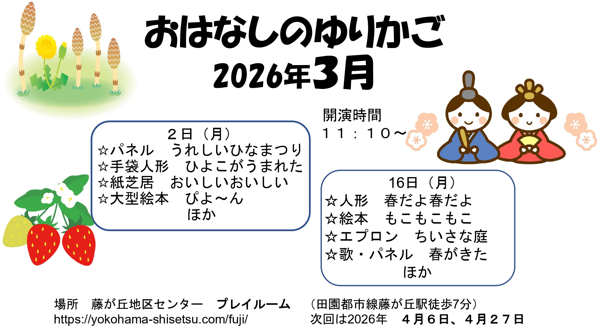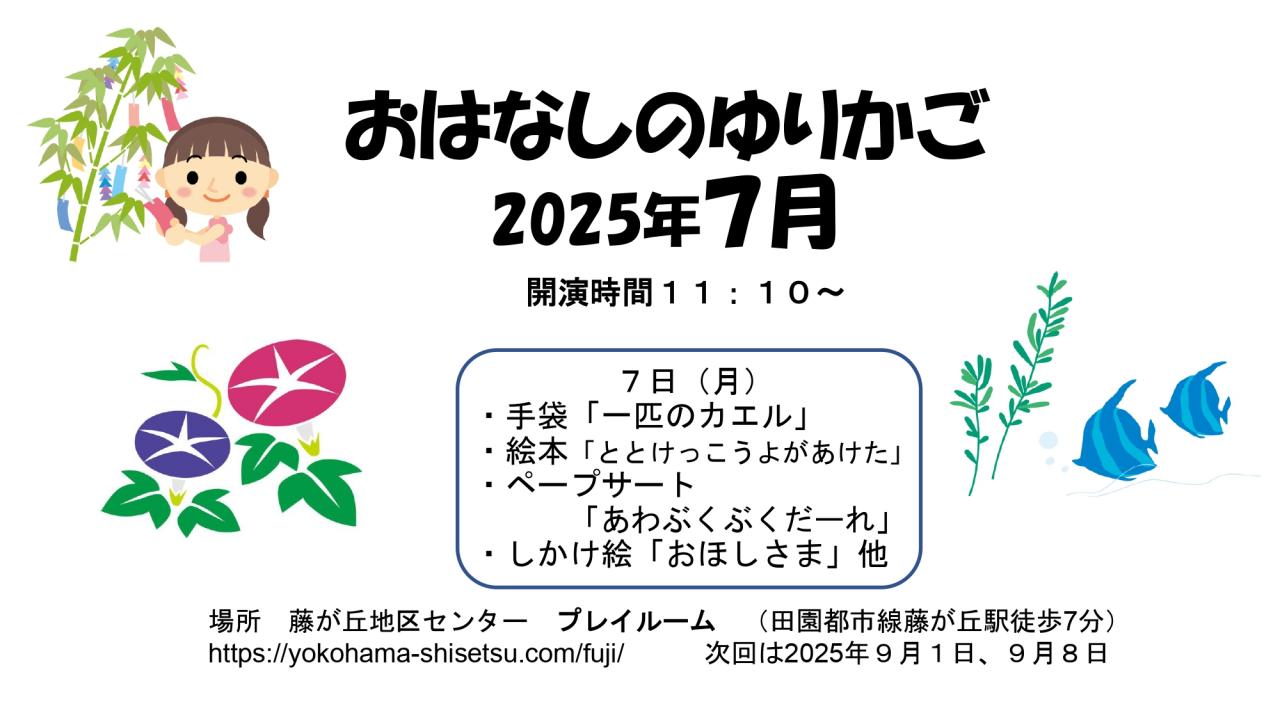 会場: 藤が丘地区センター プレイルーム (田園都市線藤が丘駅徒歩7分) 横浜市青葉区藤が丘1丁目14番地95