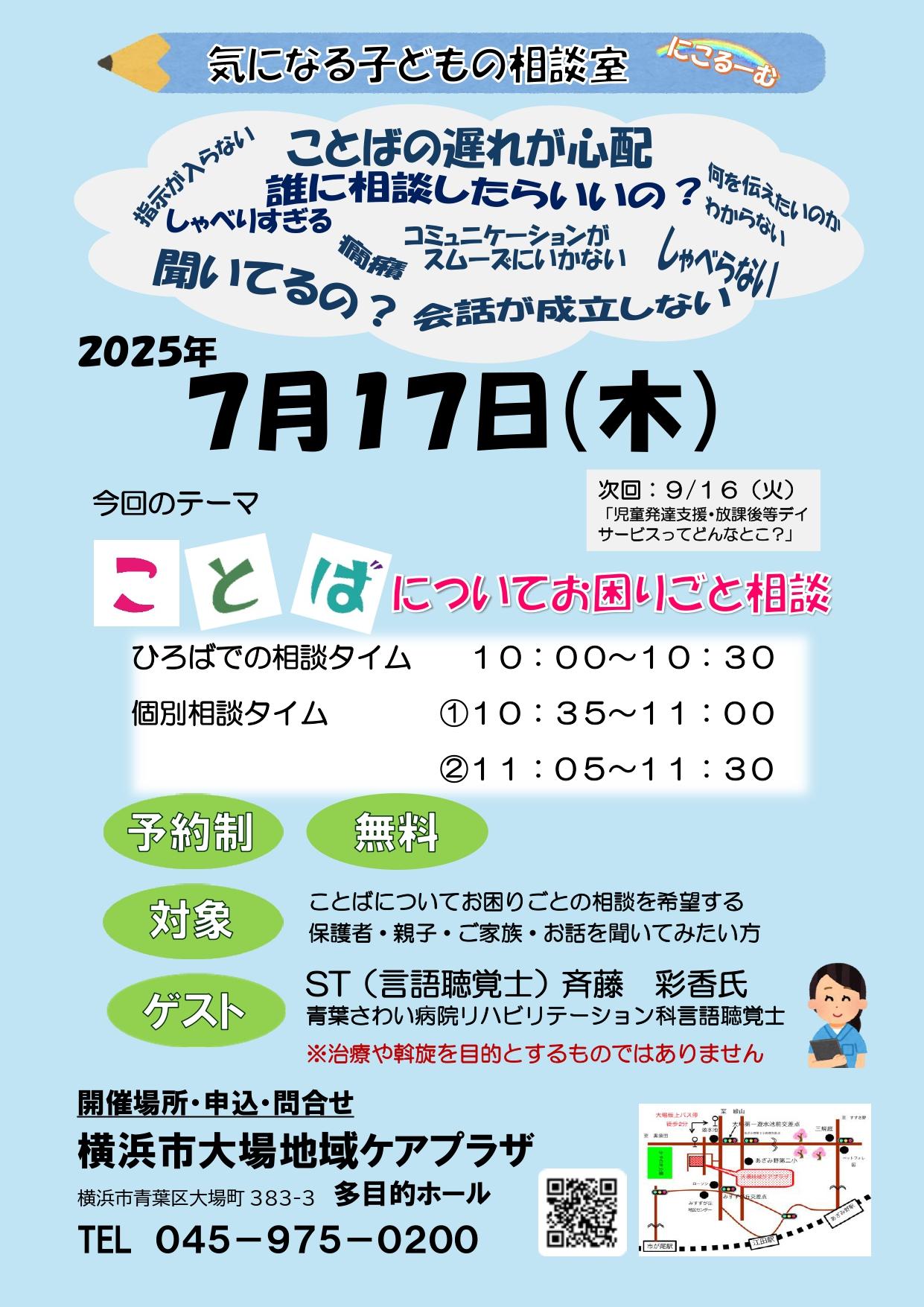 ひろばでの相談タイム10:00〜10:30 個別相談タイム�@10:35〜11:00 �A11:05〜11:30 【予約制】 【無料】 【対象】ことばについてお困りごとの相談を希望する保護者、親子、家族、話を聞いてみたい方 【ゲスト】ST(言語聴覚士)斉藤彩香氏 青葉さわい病院リハビリテーション科