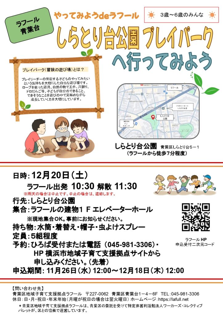 申込受付 各企画へのお申し込みは横浜市地域子育て支援拠点サイトの「イベント・講座」で受け付けます。「青葉区」「日付」を選択してください。妊娠期向け・産前産後の人向け企画妊娠期向け赤ちゃんを迎える準備会 申し込む産前産後の会 申し込む妊娠期向け赤ちゃんのお世話プチ体験(市ケ尾) 申し込む妊娠期向け赤ちゃんのお世話プチ体験(青葉台) 申し込む産前産後のからだケア(12/20(土)の産前・青葉台は申込み開始日11/26(水)12時~) 申し込むひろば企画ひろば内子育て講座「こどもとことばの話」【個別相談要予約】 申し込むやってみようdeラフール「しらとり台公園プレイパークに行ってみよう」申込11月26日(水)12:00~ 申し込むふたごみつごタイム 申し込む出張企画・区民向け企画・子育てサポートシステム入会説明会横浜子育てサポートシステム入会説明会 申し込む