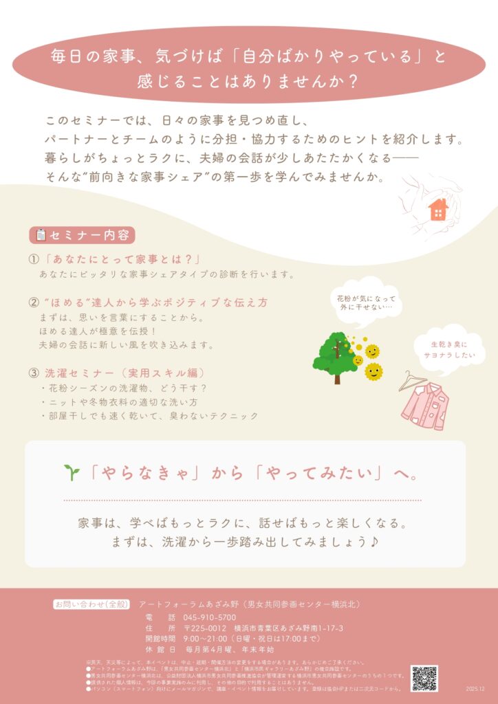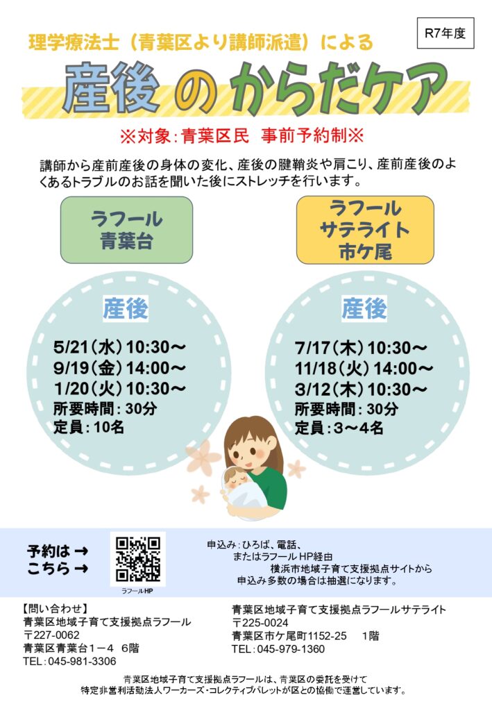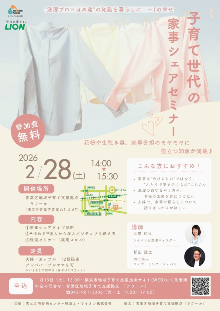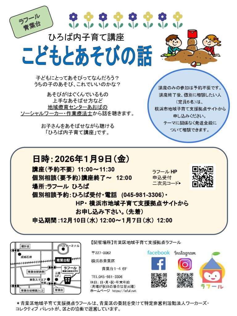 申込受付 各企画へのお申し込みは横浜市地域子育て支援拠点サイトの「イベント・講座」で受け付けます。「青葉区」「日付」を選択してください。妊娠期向け・産前産後の人向け企画妊娠期向け赤ちゃんを迎える準備会 申し込む産前産後の会 申し込む妊娠期向け赤ちゃんのお世話プチ体験(市ケ尾) 申し込む妊娠期向け赤ちゃんのお世話プチ体験(青葉台) 申し込む産前産後のからだケア(産前はこちら) 申し込む産前産後のからだケア(産後はこちら) 申し込むひろば企画「子育て世代の家事シェアセミナー」【1月13日申込開始】 詳細はこちら共催:男女共同参画センター横浜北 ライオン(株) 協力:ラフール 申し込むふたごみつごタイム 申し込むひろば内子育て講座 申し込むシングルトークのサロン 申し込む出張企画・区民向け企画・子育てサポートシステム入会説明会横浜子育てサポートシステム入会説明会 申し込む